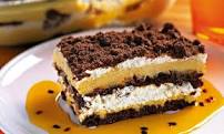 Humedeça levemente os cookies no soro do creme de leite. Em um refratário alterne camadas de cookies, creme de maracujá e chantilly. Esfarele os cookies reservados e cubra o pavê. Sirva bem gelado com a calda.