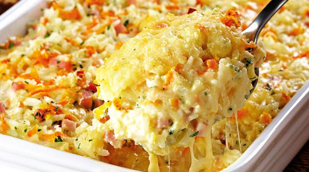 camada do arroz já cozido. Despeje a mistura e coloque tiras de presunto
